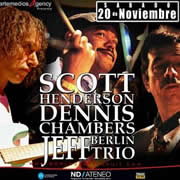 Como parte integrante del World Jazz Circuit Latin America,el próximo sábado 20 de noviembre a las 21:00 hs. se llevará a cabo, en el Teatro ND/Ateneo (Paraguay 918, Ciudad de Buenos Aires), la actuación del trío conformado por el guitarrista Scott Henderson, el bajista Jeff Berlin y el baterista Dennis Chambers.